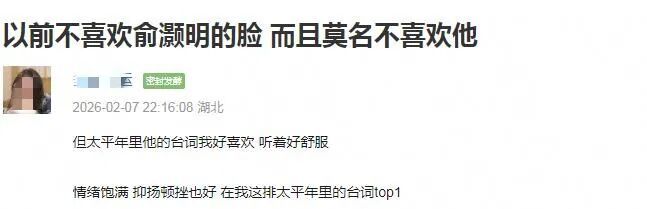 前几天在郫县国产剧小组看到一个夸俞灏明业务能力的帖子。发帖的小妹妹说,以前不喜欢俞灏明的脸,但这次看《太平年》被他的台词征服了,情绪饱满、抑扬顿挫也好,听着好舒服。